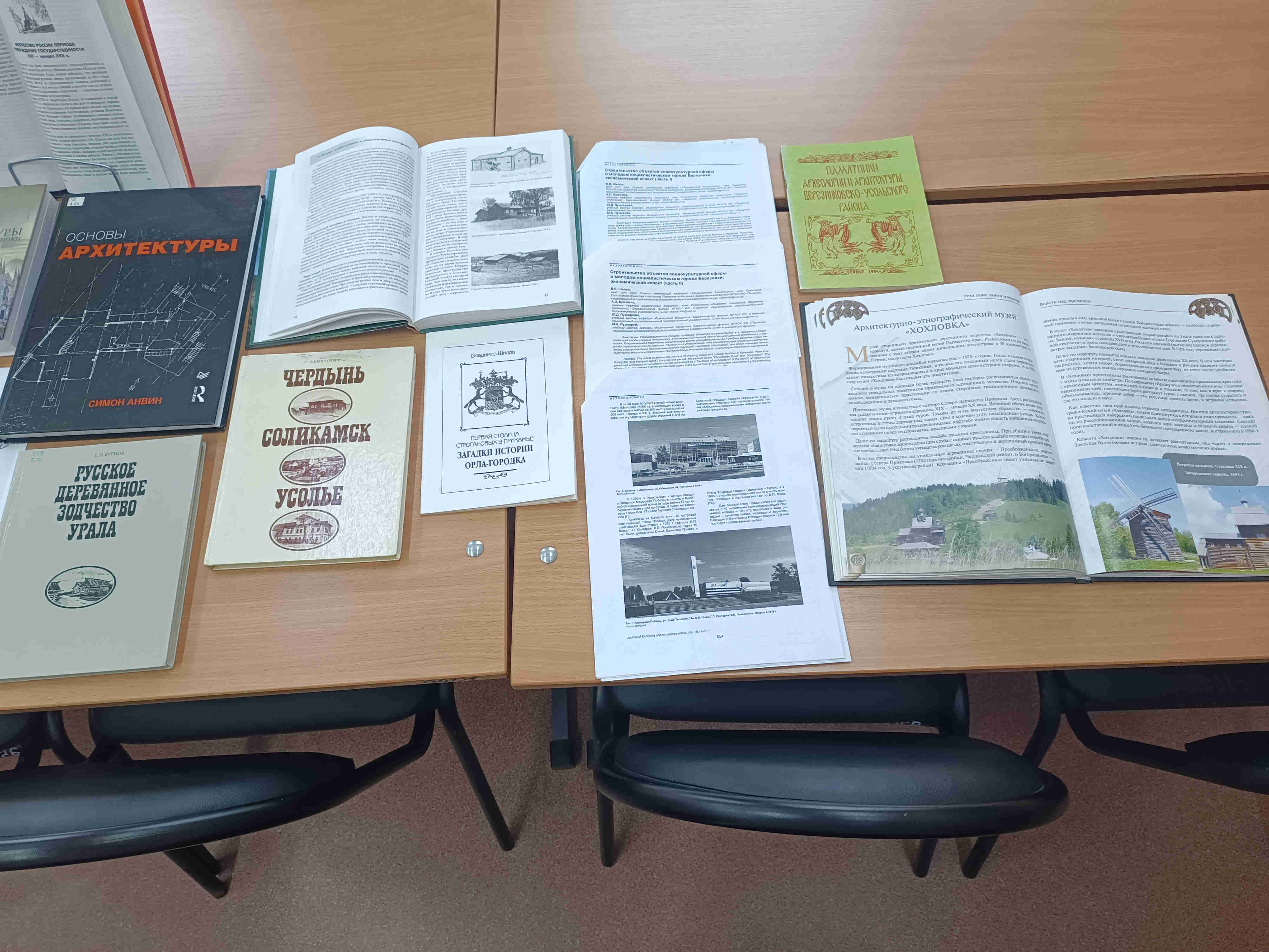 Отдельным блоком на выставке представлены издания краеведческого характера. Это книга научно-популярного содержания БУБНОВА Е.Н. «Русское деревянное зодчество Урала», в которой приводятся сведения о типах жилых домов на Урале, уральских заводских поселках, показаны некоторые образцы промышленной, крепостной и культовой архитектуры. Здесь же предлагаются вниманию книги об архитектурном наследии городов Верхнего Прикамья – Чердыни, Соликамска, Усолья, брошюры о памятниках архитектуры Березниковско-Усольского района, истории Орла-городка.